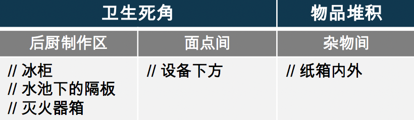 存在大量衛(wèi)生死角的區(qū)域主要在兩處:后廚制作區(qū)面點(diǎn)間。