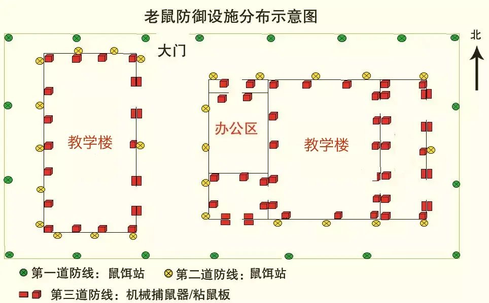 防控關鍵:PCO最重要的就是進行學校外圍的鼠密度控制,除了進行常規(guī)的建筑結構漏洞排查(門、窗等進出渠道),拜耳建議設立三道防線=*道外圍防控+第二道建筑防控+第三道內(nèi)部防控(2道化學防線+1道物理防線)