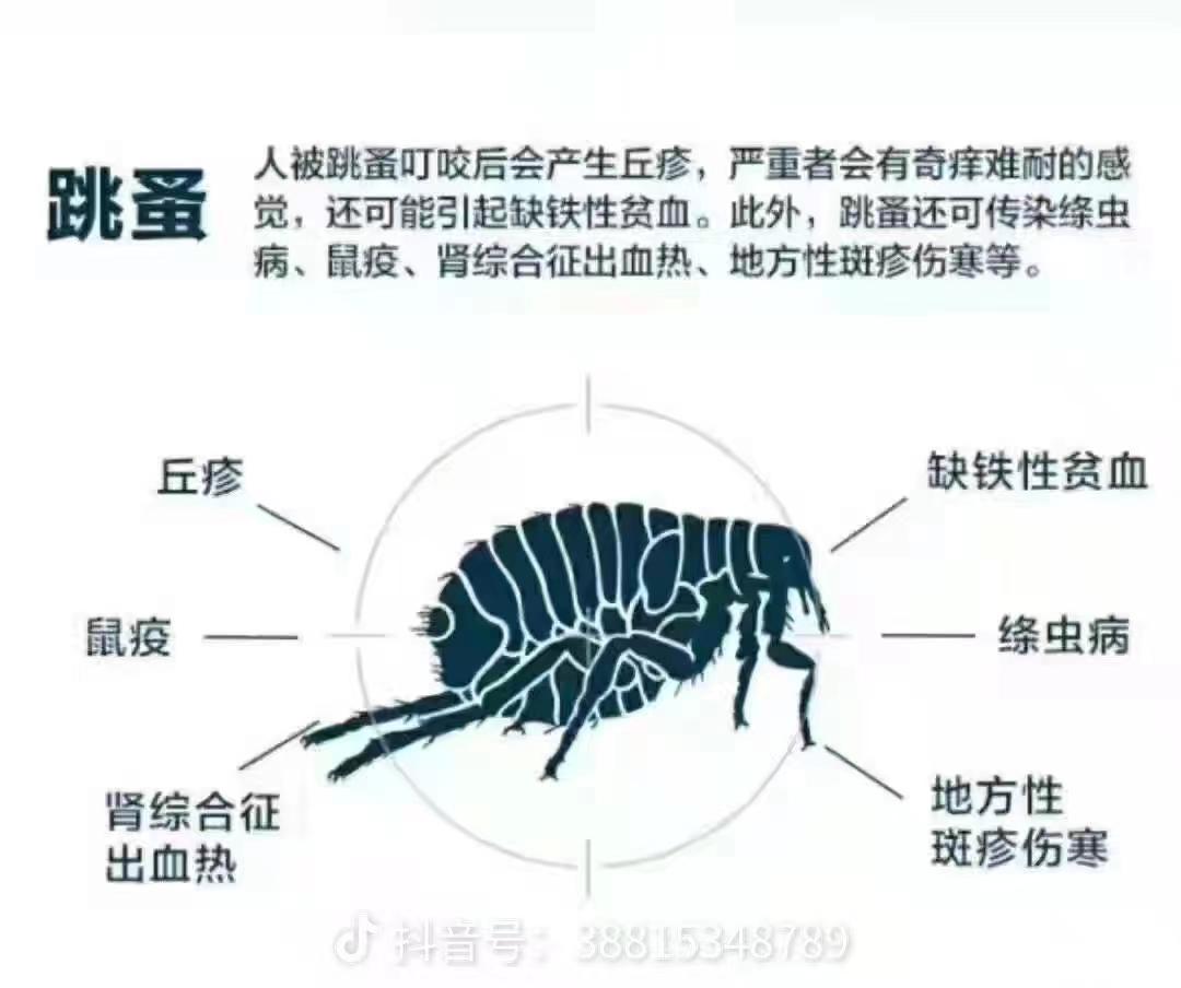 跳蚤身上帶有致病菌等病原微生物,對人類有一定的傷害,如果不小心被跳蚤咬傷,除了起包、奇癢難忍以外,它們還可能給我們帶來一些潛在的危害。